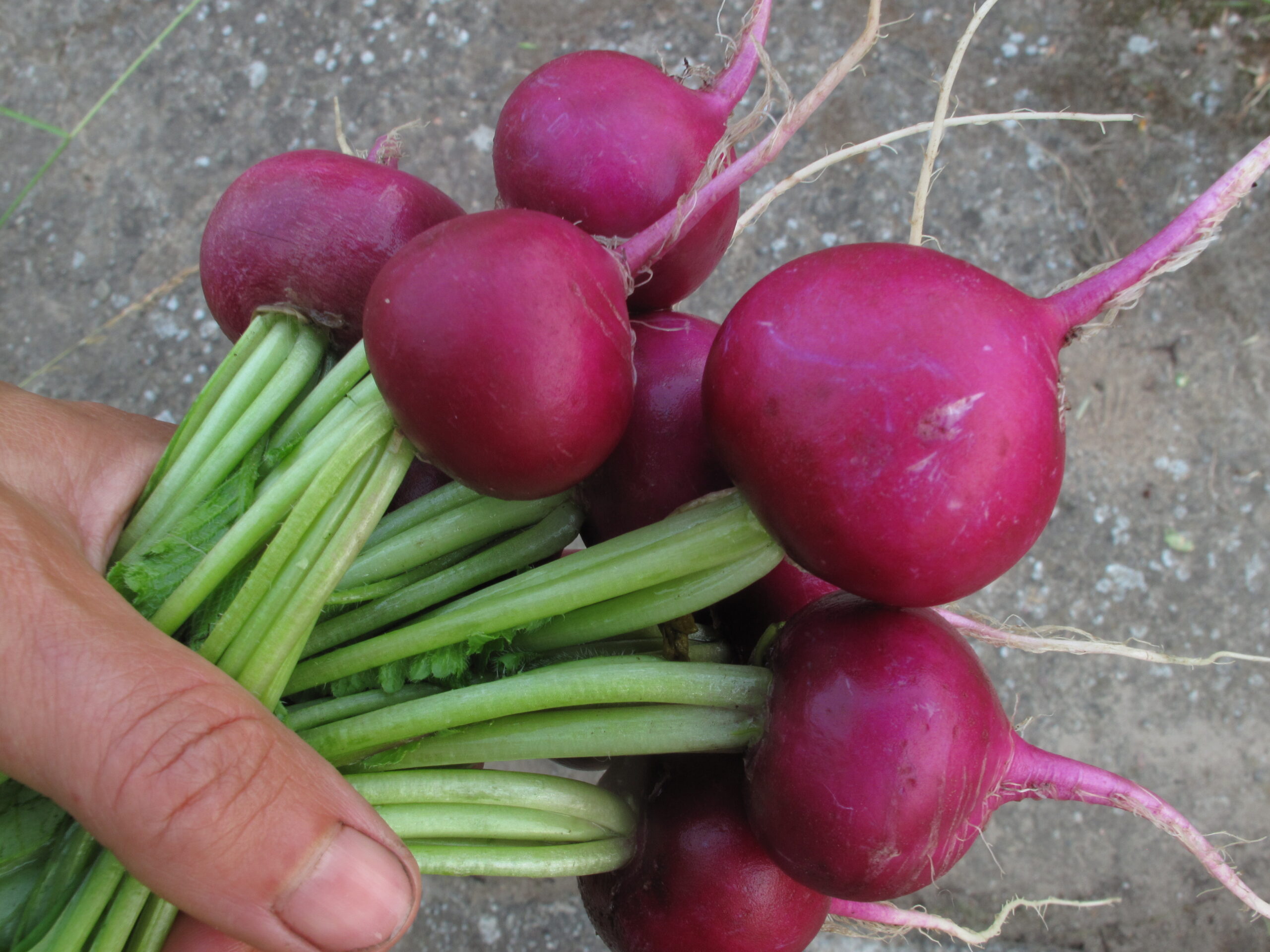 Die alten Radieschen-Sorten ‚Purple Plum‘ und ‚Certus‘ haben in der Anbauprüfung gut abgeschnitten und scheinen für den ökologischen Erwerbsanbau geeignet. Sie sind knackig in der Konsistenz, aromatisch und liefern einen ausreichenden Ertrag. Andere Sorten wie ‚Chrestensens Bicolor‘ wurden hingegen wieder aus dem Anbau genommen, da sie sehr schnell pelzig oder holzig wurden und geschmacklich nicht überzeugten. Das Saatgut der Radieschen ‚Purple Plum‘ gibt es zum Beispiel beim Samenbau-Betrieb der Keimzelle und beim VERN e.V. zu erwerben. Als Frischgemüse findet sich diese Radieschen-Sorte in der Saison z.B. im Hofladen der Domäne Dahlem wieder. Für die Vermarktung stehen den Betrieben Kommunikationsmaterialien zur Verfügung, die im Rahmen des Forschungsprojekts „ZenPGR“ entstanden sind. Außerdem wurde das Label „Sortenschätze“ für die Vermarktung der alten Gemüsesorten aus der gemeinsamen Erhaltungsarbeit des SaatGut-Erhalter-Netzwerk Ost entworfen.